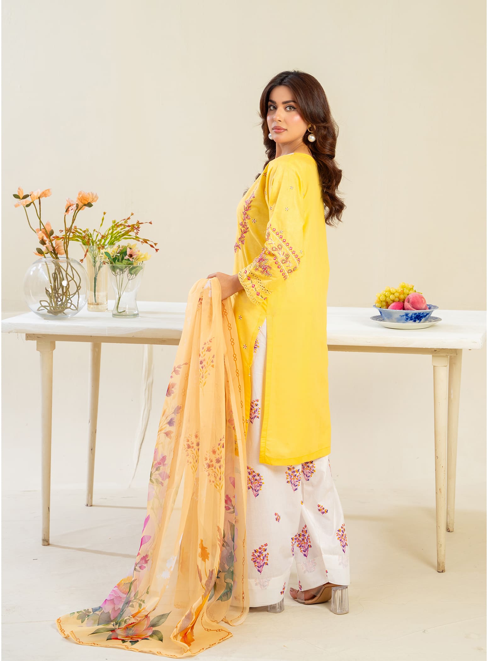 This elegant outfit features a short embroidered kurta in soft cotton, paired with a stylish farshi shalwar for a traditional yet trendy touch. The look is completed with a light chiffon dupatta, making it a perfect blend of comfort and grace. Ideal for casual wear and gatherings, this ensemble adds a pop of color to your everyday style.