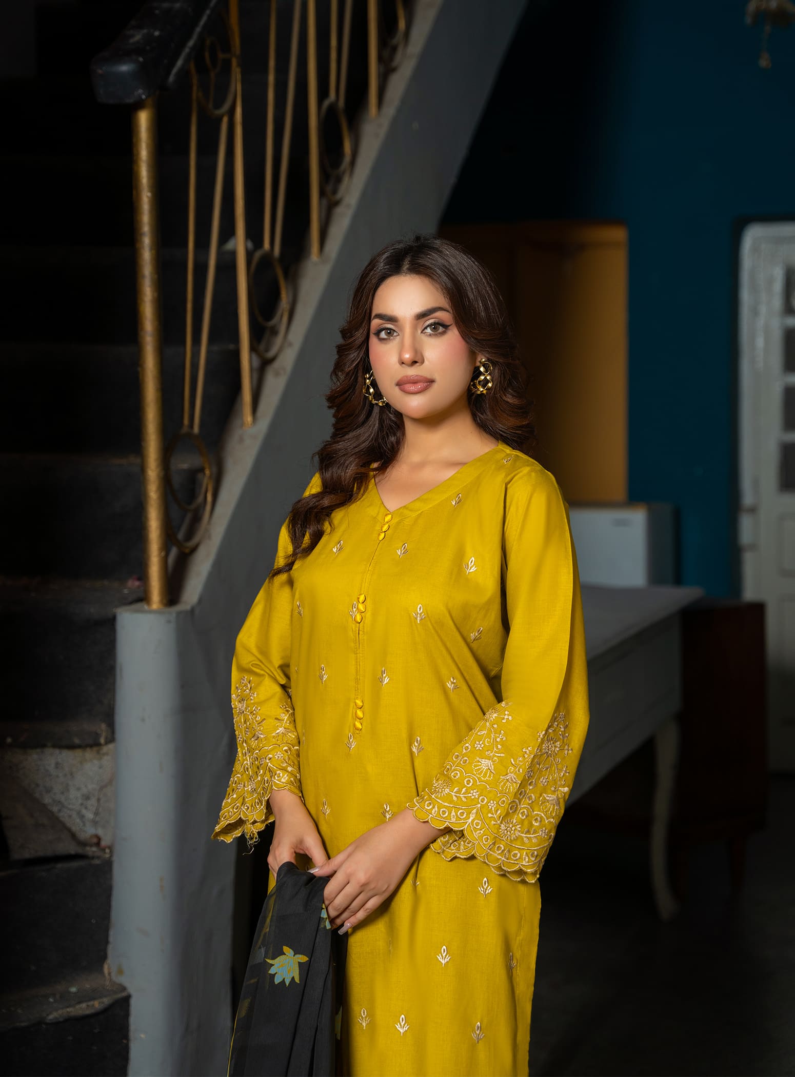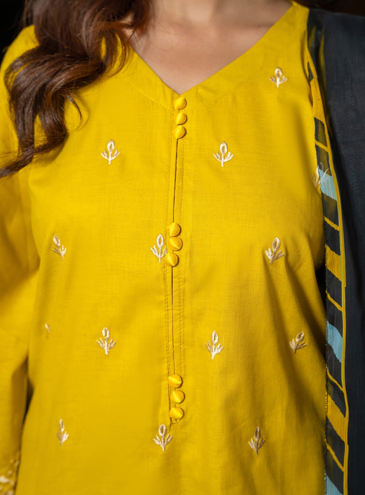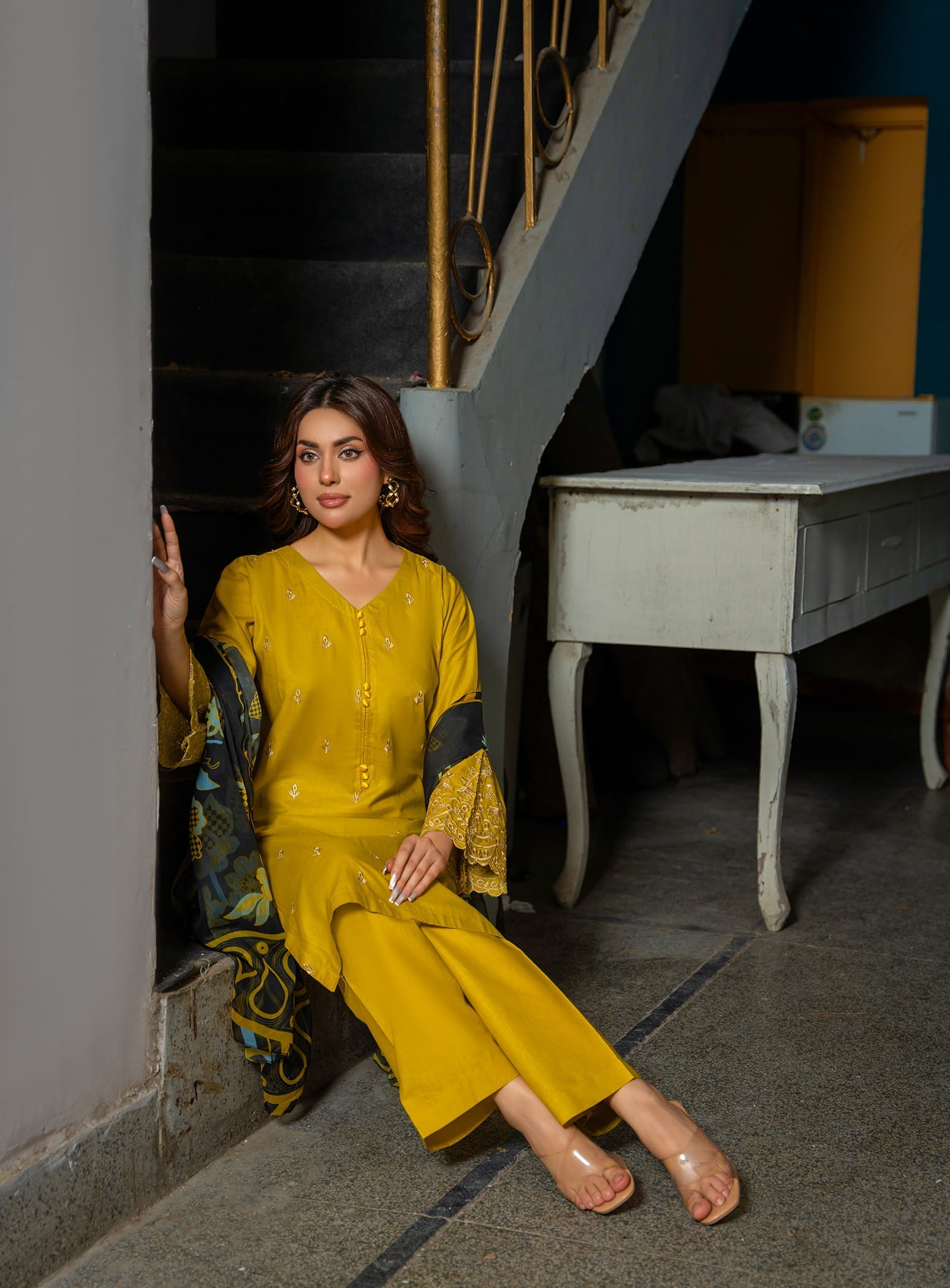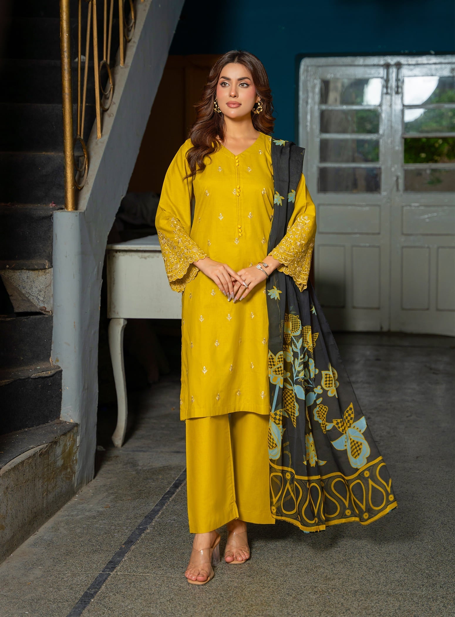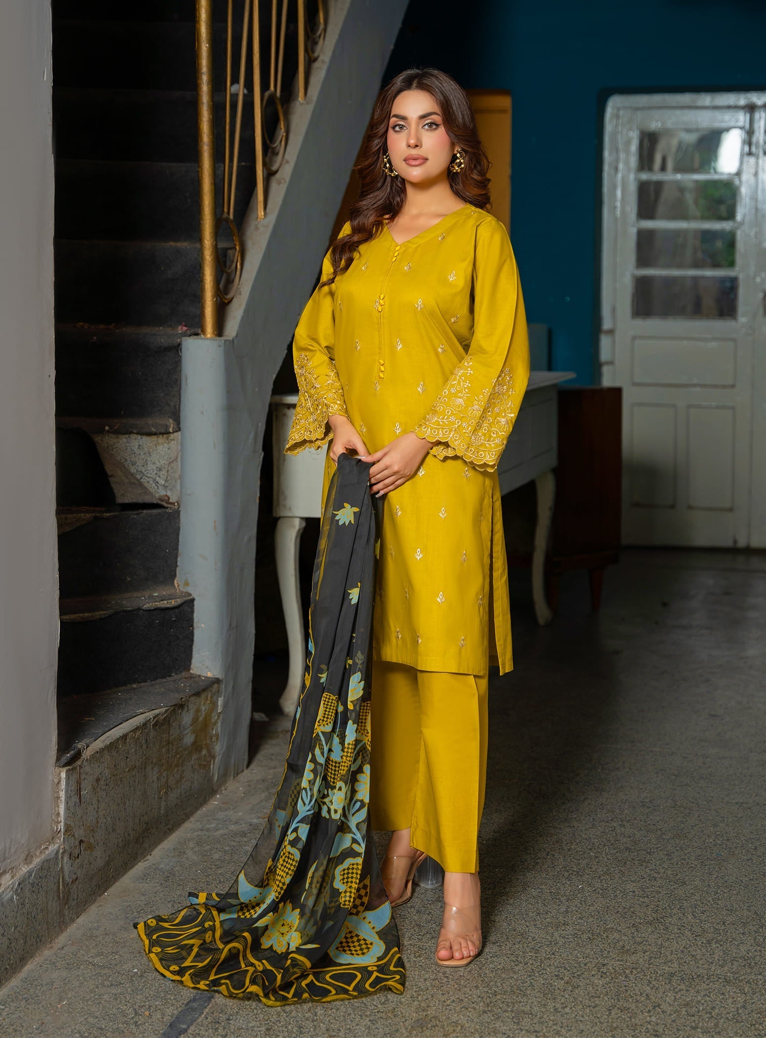This elegant ensemble features a beautifully embroidered long kurta in a graceful mustard shade, paired with a comfortable straight trouser. To complete the look, a stunning digital printed dupatta adds charm and style, making it a perfect pick for both casual outings and daily wear.