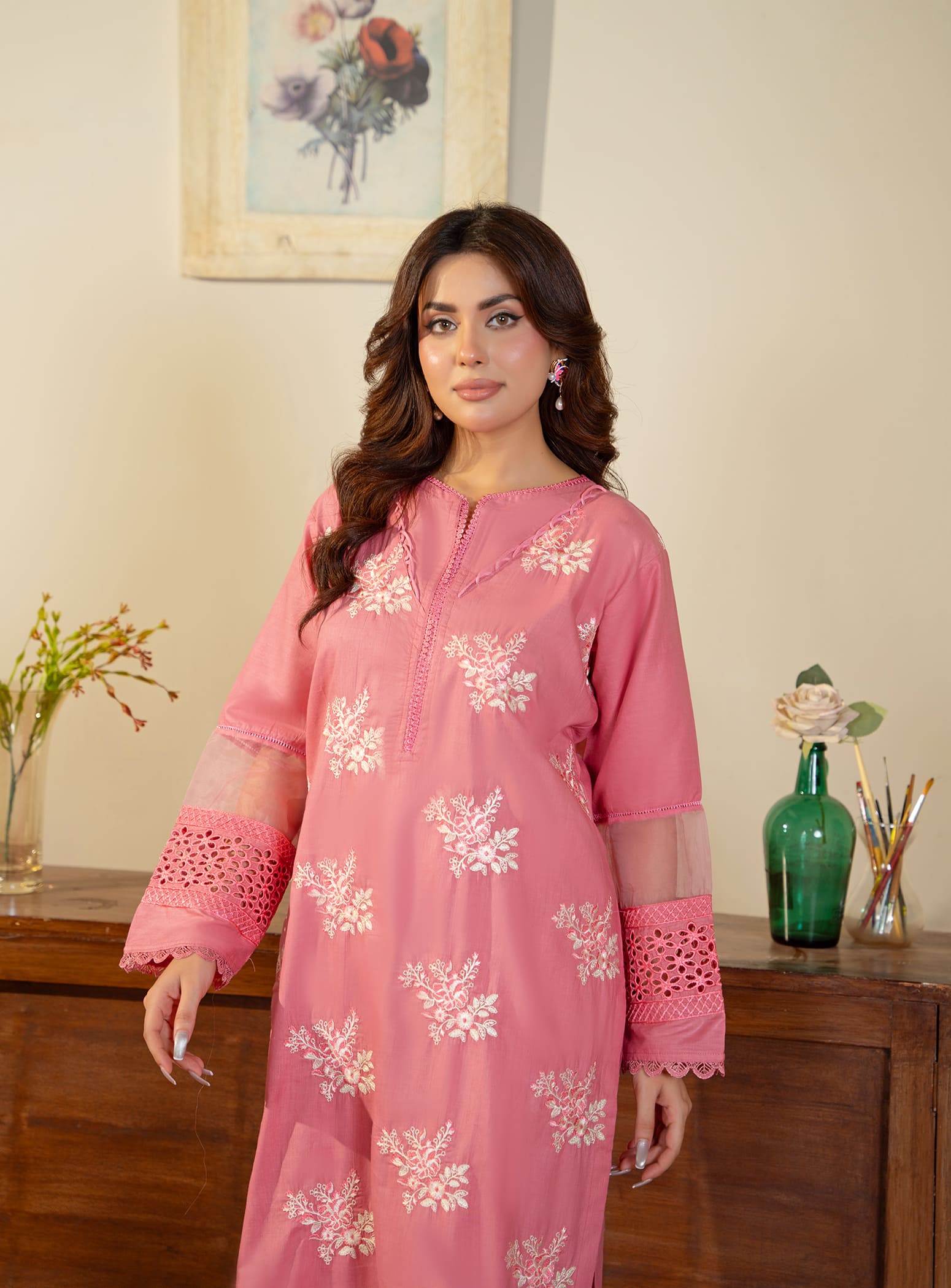 Crafted from breathable cotton fabric, this long embroidered kurta in a soft pink hue exudes charm and sophistication. It is paired with a matching straight trouser for everyday comfort, while the elegant poly silk dupatta adds a touch of refined beauty. Perfect for daily summer wear, Pink Aura combines elegance with effortless style.