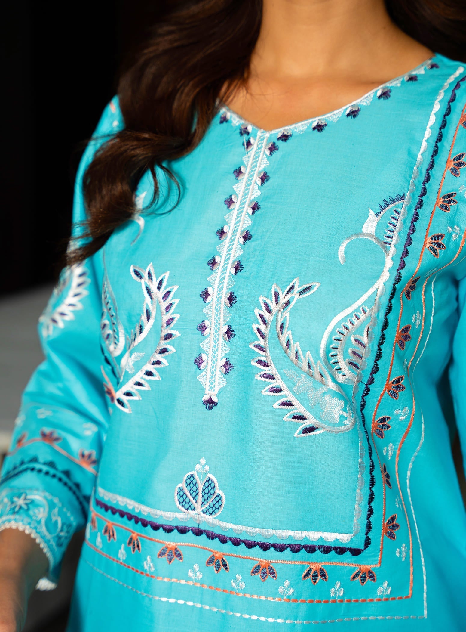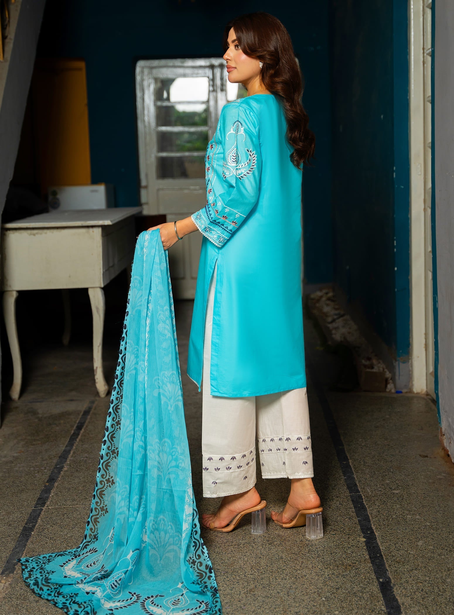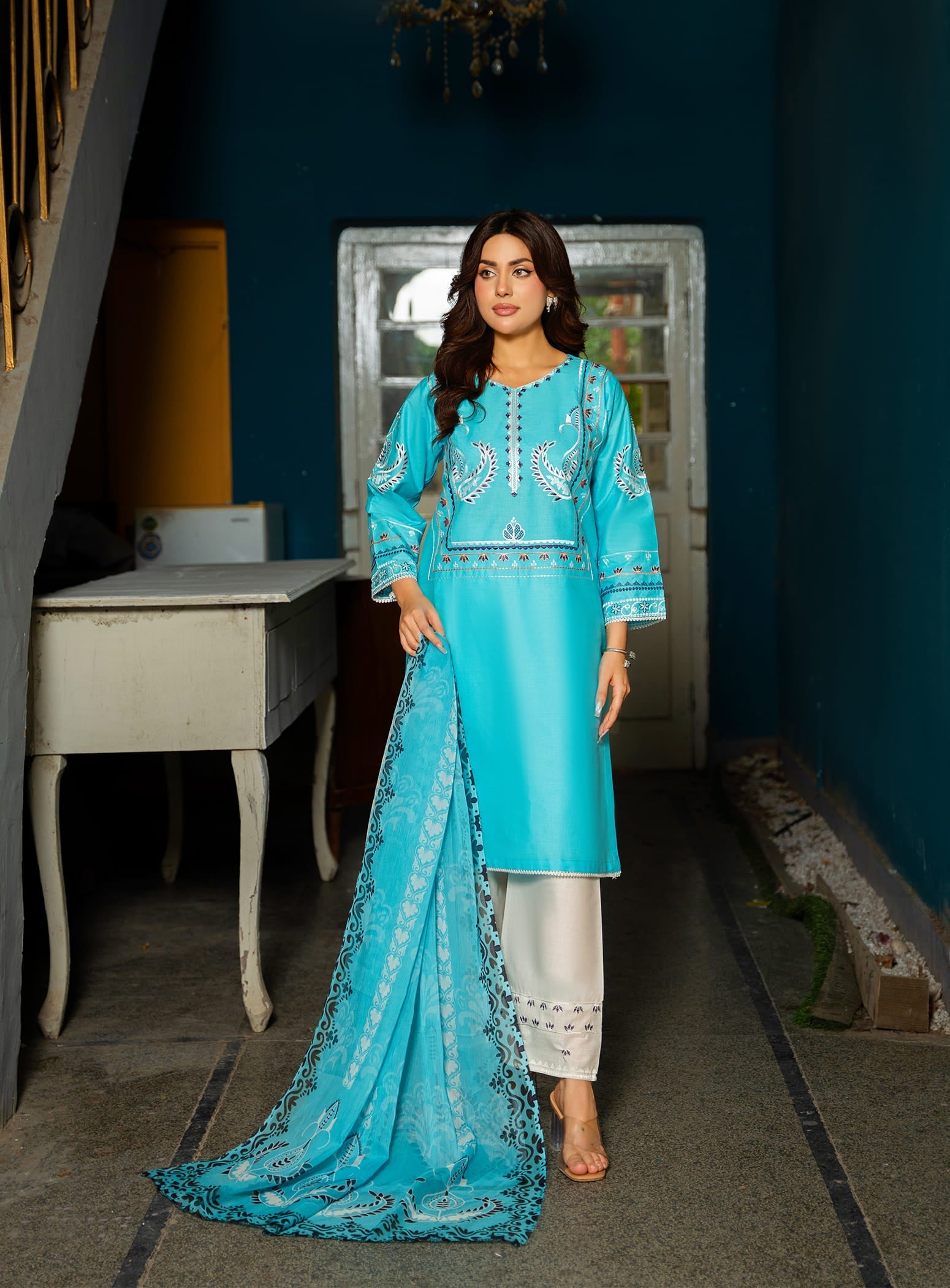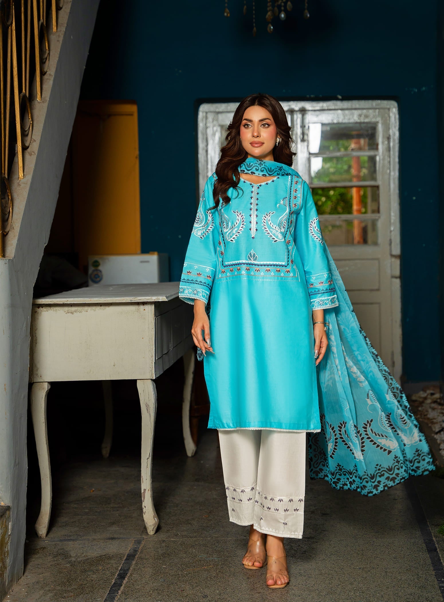 Made from breathable cotton fabric, this aquamarine ensemble features a beautifully embroidered straight cut kurta with a matching straight trouser. The look is completed with a stunning digital printed dupatta, adding a vibrant yet graceful touch – making it a perfect choice for daily wear.